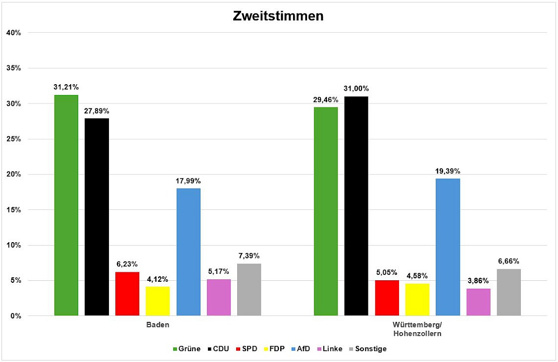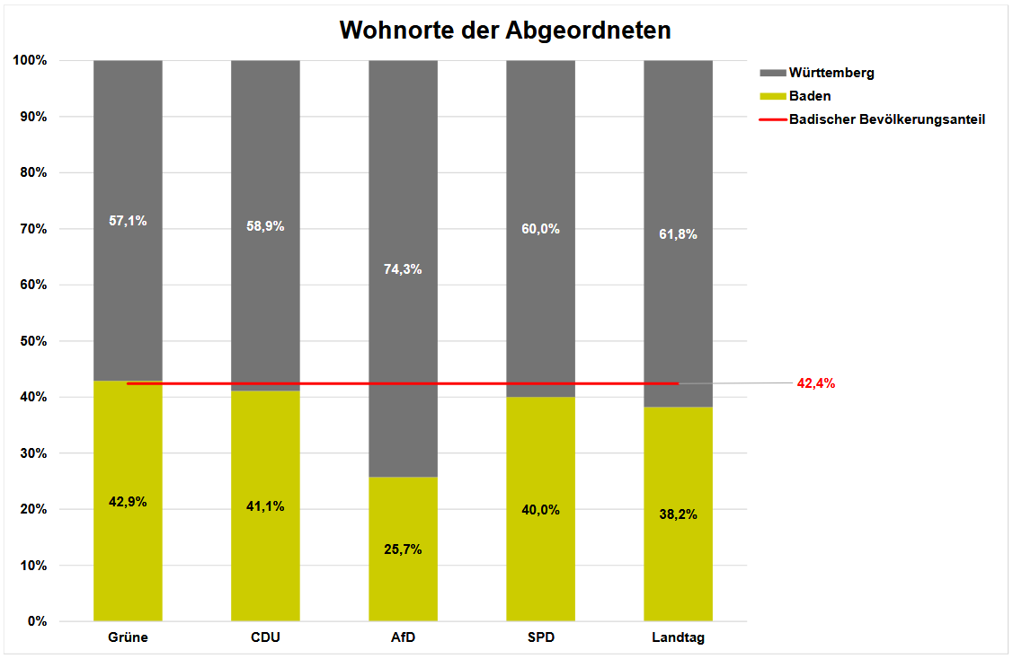 Im 2021 gewählten Landtag betrug der Anteil der im historischen Baden wohnenden Abgeordneten ca. 44% und entsprach damit sogar leicht mehr als dem Anteil an der Gesamtbevölkerung von 42,4%. Im neuen Landtag hingegen sind badische Abgeordnete nun gemessen an der Bevölkerungsverteilung unterrepräsentiert: nur 38,2% der Abgeordneten wohnen in Baden.Dies liegt hauptsächlich an der Fraktion der AfD, die nur aus 25,7% in Baden wohnenden Abgeordneten besteht. Die Fraktionen der Grünen, CDU und SPD setzten sich nach den Wohnorten der Abgeordneten betrachten, annähend aus einem der Gesamtbevölkerung entsprechendem Verhältnis zusammen.